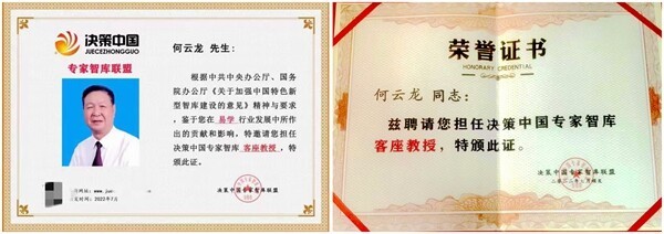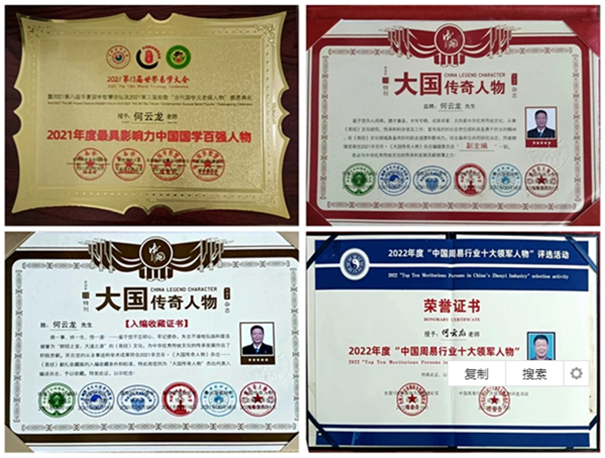 先后荣获2021年”最具影响力中国国学百强人物“,2022年度“中国周易行业十大领军人物”,2023年荣获“世界华人国学泰斗级人物”荣誉称号。个人事迹入编大国传奇人物杂志(易经)献礼收藏版,世界华人国学名人名家年鉴等权威刊物。并被多家政界企事业单位及富人特聘风水顾问。
