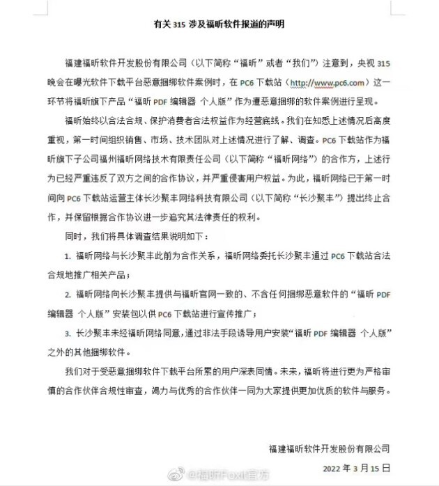 声明中表示,PC6下载站作为福昕软件旗下子公司——福州福昕网络技术有限责任公司(以下简称“福昕网络”)的合作方,其行为严重违反了双方之间的合作协议,并严重侵害用户权益。为此,福昕网络已于第一时间向PC6下载站运营主体长沙聚丰网络科技有限公司(以下简称“长沙聚丰”)提出终止合作,并保留根据合作协议进一步追究其法律责任的权利。