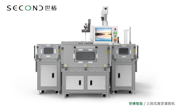 自成立以来,世椿智能始终专注流体应用设备的研发、生产、销售与服务,以“成为流体应用行业百年服务品牌”为愿景,致力于为全球客户提供领先的工业智能装备整体解决方案。由世椿智能打造的IGBT三段式真空灌胶线,为三级真空箱设计,由上板机、接驳台、AOI检测机、三段式真空灌胶机、真空供料系统、两位移栽机、双轨固化炉、两位移栽机、下板机等设备组成,实现产品自动上料、AOI检测、灌胶、烘烤、下料的完整工艺流程,具有如下技术优势:
