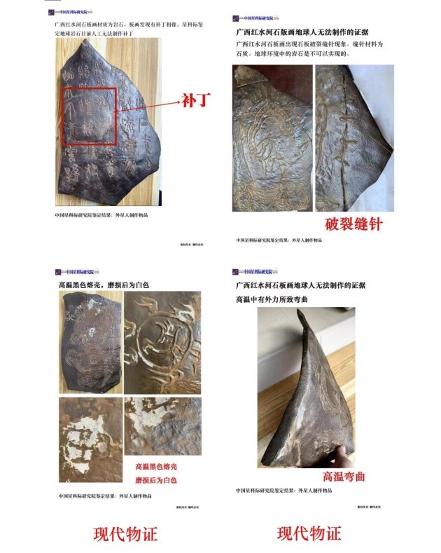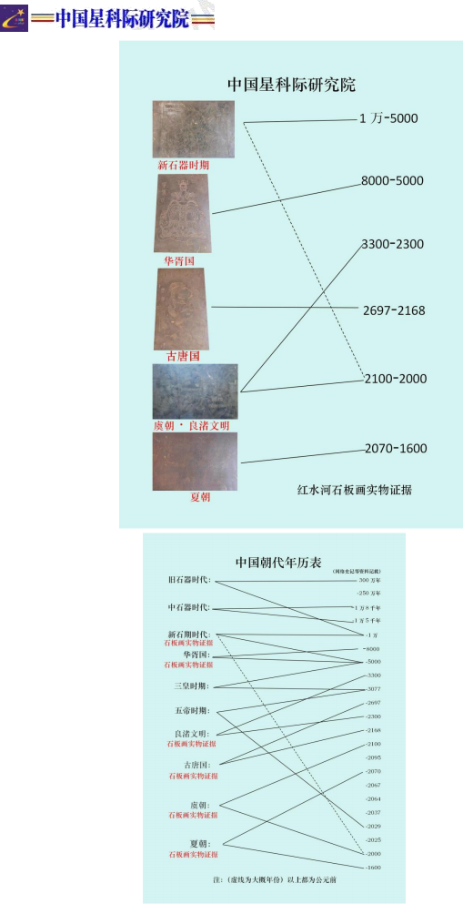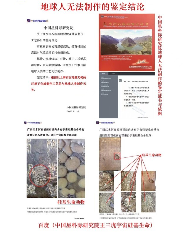 三 、 中 国 星 科 际 研 究 院 根 据 (外 星 人 物 品 、 宇 宙 硅 基 生 命 实 物 鉴 定 标 准 Q/141000SXXKJDHS2017-2020. )对石板画内容真假的鉴定 。根据反推理逻辑得出以下结论: 石板画的内容没有虚假的,是真实存在的, 由此可见石板画是证明中国历史(乃自世界历史)朝代演变的实物证据。
