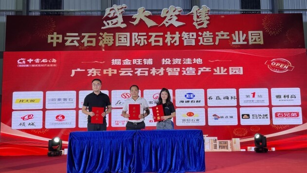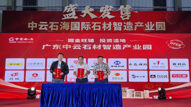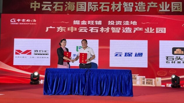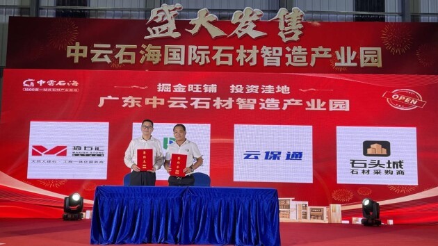 广东云浮“白石世界”再引领中国石都新方向!中云石海董事长关海棠与合营企业云浮市云保通贸易、厦门市石头城集团现场签约。