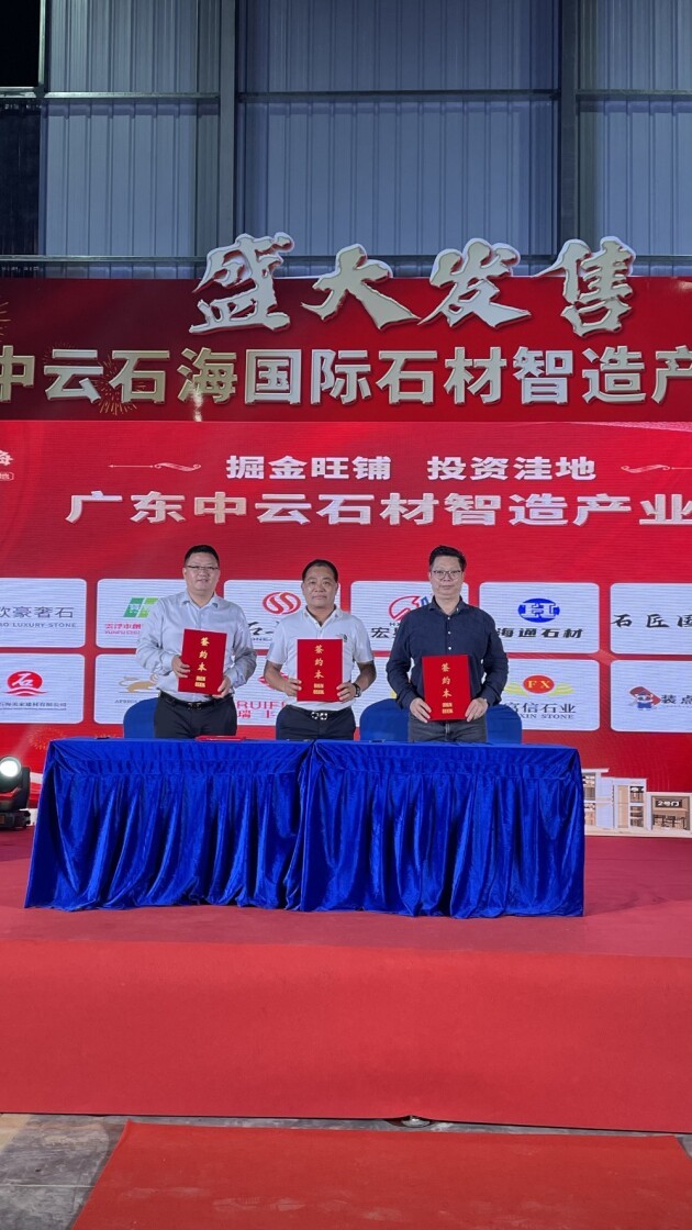 广东云浮“白石世界”再引领中国石都新方向!中云石海董事长关海棠与入驻企业广东石海美家建材、云浮市硕城石业、云浮市欧豪石材、云浮市小石头网络科技现场签约。