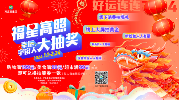 宇宙中心万家丽新春送福第一弹:“福星高照”幸运宇宙人大抽奖,在万家丽国际购物广场全场单笔消费满199元,美食类单笔消费满99元,万家丽生活超市消费满99元,均有机会赢取黄金饰品、品牌手机、超市购物卡、豪华客房体验券、大牌美食券,2 月 24 日活动当天,加入万家丽粉丝群并关注微信公众号或注册万家丽美妆会员还有现金红包雨、大牌美食券、新春福气礼包等惊喜福利等着你,更多活动详情请关注“万家丽国际MALL”微信公众号!