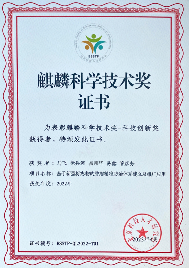 近期,麒麟科学技术奖评审委员会公布了2022年度麒麟科学技术奖评审结果。徐兵河院士&马飞教授团队联合吉因加申报项目——基于新型标志物的肿瘤精准防治体系建立及推广应用,荣获麒麟科学技术奖-科技创新奖。