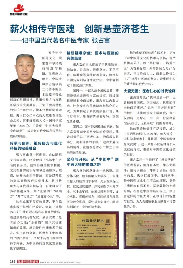 五千年中医药文化,凝聚着中华民族的智慧与精髓。在燕赵大地上,中医大师张占富以其三代传承的医术底蕴和锐意创新的科研精神,将祖传秘方与现代医学技术完美融合,开创了独具特色的张氏中医疗法。他不仅精研疑难杂症,更以仁心仁术点亮无数患者的生命之光。其事迹被载入《中国科学家年鉴(2024)》,并荣获“中医大师终身成就奖”,成为新时代中医药传承与创新的典范。