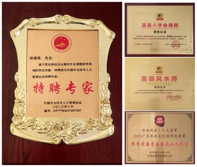 近年来,邱佛英凭借专业素养与实战经验,在国学易学领域斩获诸多权威认证。2023年10月,他被中国专业技术人才管理协会特聘为易经风水国学专家;2024年,他先后取得高级风水师证书、八字命理师考试优异成绩、易经风水师考试佳绩;2025年5月,荣获高级国学文化传承师合格证书。