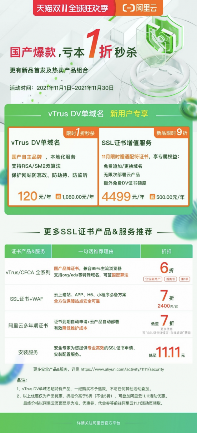 阿里云2021年“双11上云狂欢节”火爆开启,vTrus 爆款证书1折秒杀、vTrus全系列SSL证书超低折扣优惠、更有买增值服务限时免费送证书以及超低价的证书辅助服务,广大用户翘首以盼的SSL证书正处于一年中最佳入手时机。值得称道的是,今年的阿里云狂欢优惠活动时间为2021年11月1日—2021年11月30日,整整一个月的钜惠狂欢,真正的亏本大放送!