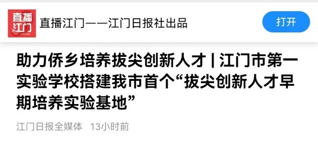就在昨天(3月18日),中国侨都——广东江门权威媒体《直播江门》以《助力侨乡培养拔尖创新人才 | 江门市第一实验学校搭建我市首个“拔尖创新人才早期培养实验基地”》为题,聚焦并肯可江门一实敢为人先——建平台、聚名师,助力侨乡培养拔尖创新人才!