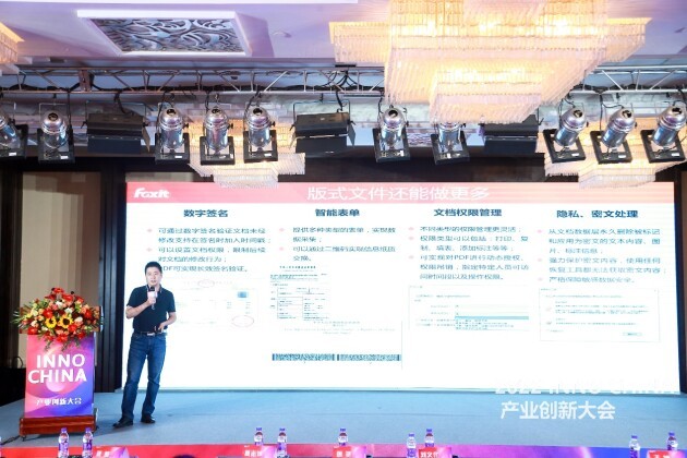 福昕软件作为版式文档领域的企业代表,携版式文档技术及产品体系亮相本届大会。福昕中国区总经理刘文化在大会上发表了《版式文档技术助力企业无纸化办公》的主题演讲,他分析了现阶段企业面临的无纸化转型重难点,并结合福昕公司多年客户服务经验和案例,归纳出版式文档技术的多类别应用场景,并科学地提出了以福昕版式文档技术为基座的企业无纸化办公新思路。
