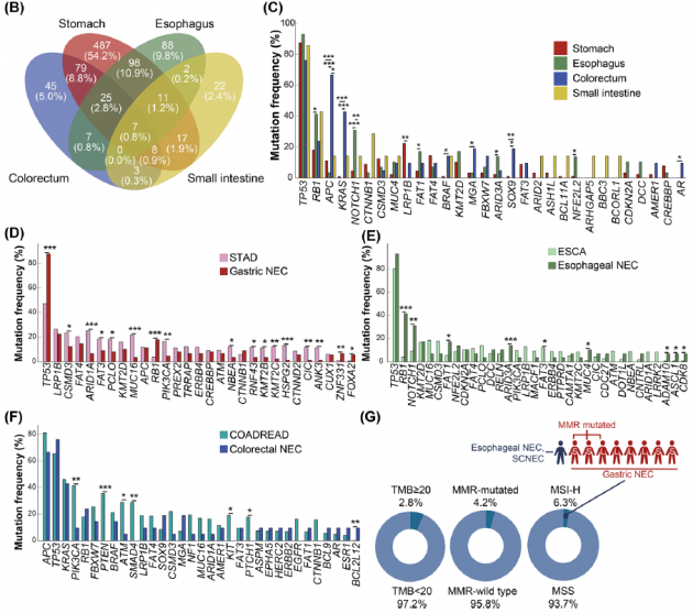 此次研究招募了被确诊为纯GI-NEC、尚未接受新辅助治疗的患者,并收集胃肠道不同解剖部位的NEC组织和邻近正常组织样本,通过NGS平台进行全外显子组测序,以此表征GI-NEC的基因组特征及其异质性。